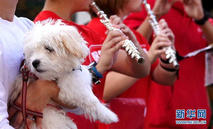 9月29日,在美國(guó)加利福尼亞州伯林蓋姆市,一支學(xué)生樂(lè)隊(duì)參加寵物狗大游行活動(dòng)。美國(guó)加州舊金山灣區(qū)的伯林蓋姆市29日舉行寵物狗大游行活動(dòng)。新華社記者吳曉凌攝