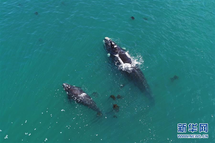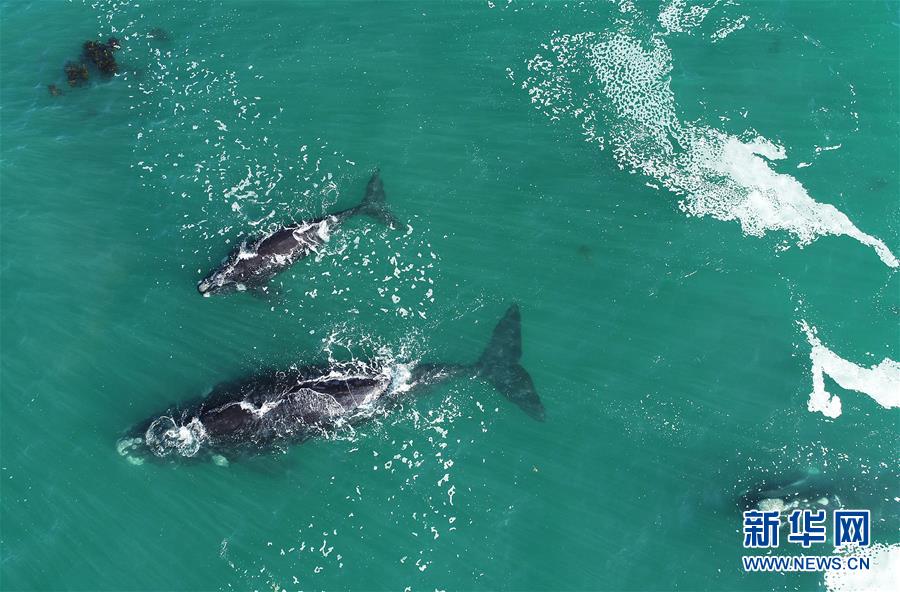 9月30日,在南非赫曼紐斯小鎮(zhèn)附近海面上,2頭南露脊鯨在海岸邊暢游。9月29日,位于開(kāi)普敦以東約115公里的赫曼紐斯小鎮(zhèn)迎來(lái)2018年的鯨魚節(jié),來(lái)自世界各地的游客可乘船出海觀鯨,也可在岸邊等待鯨魚的到來(lái)。新華社記者陳誠(chéng)攝