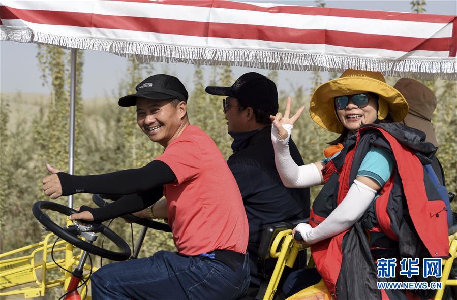 10月1日,游人在新疆和田市大漠胡楊景區(qū)游覽。