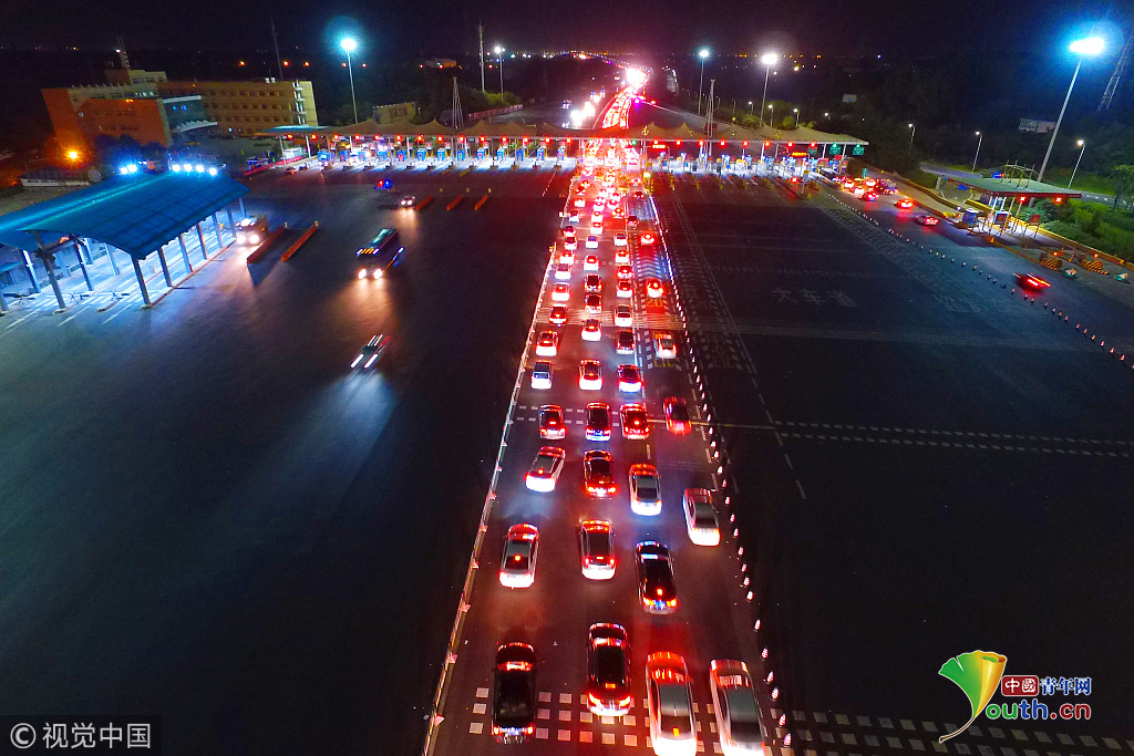 2018年10月1日,國(guó)慶假期首日凌晨1點(diǎn)左右,南京迎來出行高峰,所有高速公路出城方向迎來大批車輛,航拍南京長(zhǎng)江二橋收費(fèi)站,大量車輛排起長(zhǎng)龍,場(chǎng)面尤為壯觀。圖片作者:方東旭