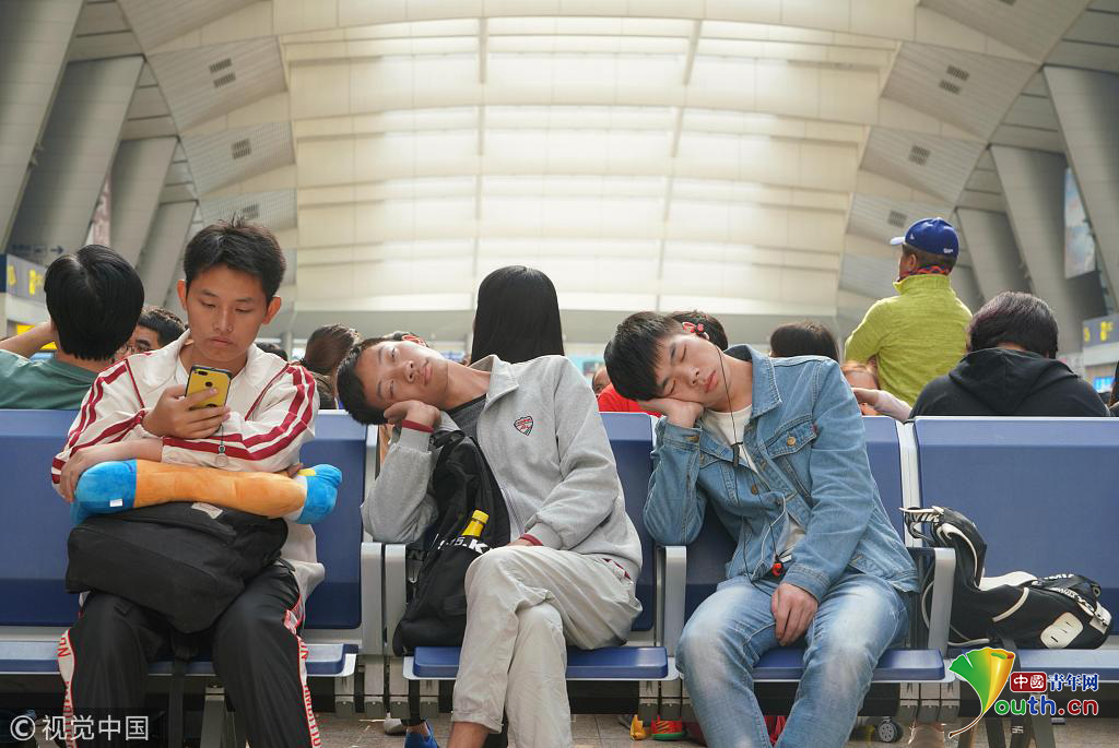 2018年10月1日,兩名旅客在北京南站內(nèi)候車時(shí)打盹。當(dāng)天是國(guó)慶假期首日,北京南站迎來客流高峰。此前,據(jù)北京鐵路局預(yù)計(jì),國(guó)慶黃金周將發(fā)送旅客1168萬(wàn)人,同比增加19.9萬(wàn)人。其中10月1日為出行高峰日,預(yù)計(jì)當(dāng)天發(fā)送旅客143萬(wàn)人,同比增加4.7萬(wàn)人。圖片作者:張興龍