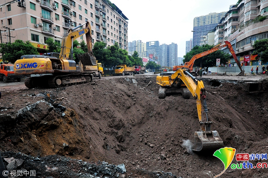 中國青年網(wǎng)北京10月9日電 2018年10月8日消息,四川達州。10月8日從四川省達州市達川區(qū)委宣傳部獲悉,7日14時30分左右,達川區(qū)東環(huán)南路103號人行道路面發(fā)生塌陷險情,經(jīng)調取視頻監(jiān)控和走訪周邊群眾,救援人員初步判斷疑似有4人掉入坑中。圖片作者:視覺中國
