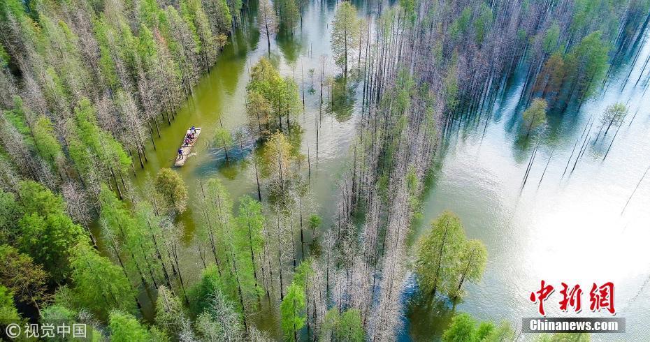 10月5日,航拍安徽宣城寧國(guó)方塘鄉(xiāng)汪村青龍湖港口灣水庫(kù),游客們泛舟湖上,穿梭于紅杉林中,享受秋日的美好時(shí)光。 圖片來源:視覺中國(guó)