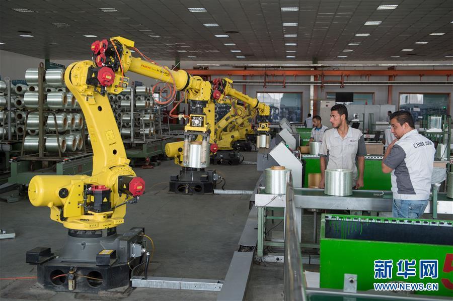 2018年8月28日,在埃及蘇伊士運(yùn)河之畔的泰達(dá)工業(yè)園區(qū),埃及工人在中國(guó)巨石埃及玻璃纖維股份有限公司(巨石埃及)生產(chǎn)車間內(nèi)工作。