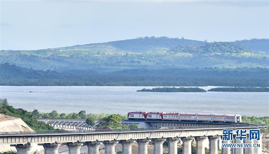 2017年5月29日,一列肯尼亞蒙內鐵路測試列車行駛在蒙巴薩特大橋上。由中國承建的蒙巴薩-內羅畢標軌鐵路(蒙內鐵路)全長約480公里,于2017年5月通車。