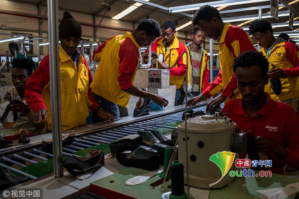 當(dāng)?shù)貢r間2018年8月1日,埃塞俄比亞。埃塞俄比亞首都亞的斯亞貝巴南部郊外,有一座東方工業(yè)園,這是中國在埃塞俄比亞的首個國家級境外經(jīng)貿(mào)合作區(qū)。園區(qū)占地5平方公里,連接著兩個60萬人口的城鎮(zhèn),目前已經(jīng)有85家企業(yè)入駐,行業(yè)涉及紡織、服裝、制鞋、鋼筋、水泥、制藥、汽車組裝等,這些企業(yè)絕大部分來自中國。圖為鞋廠工人在2015年啟用的新廠區(qū)內(nèi)工作。