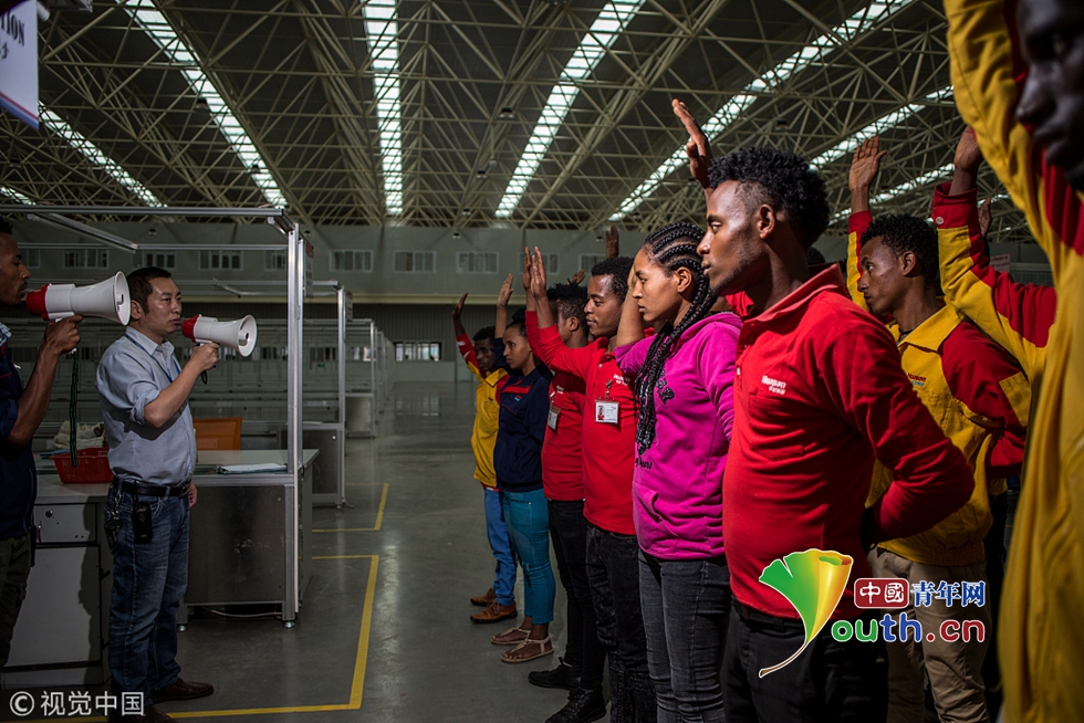 7月31日,埃塞俄比亞首都亞的斯亞貝巴的一家中國民營制鞋工廠——華堅鞋廠,下午的工作開始前,當(dāng)?shù)毓蛦T用中文喊著“一二三四”列隊集合,合唱廠歌。