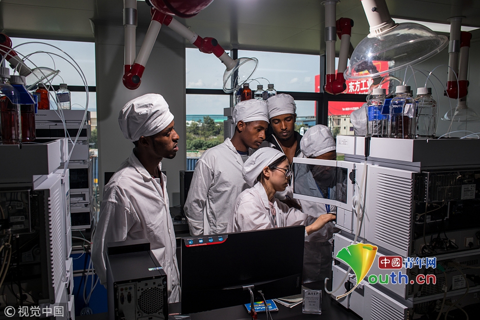 7月30日,埃塞俄比亞,首都亞的斯亞貝巴的東方工業(yè)園內(nèi)一家中國制藥廠,27歲的中國員工汪紅梅為當(dāng)?shù)毓蛦T講解液相色譜器械使用要領(lǐng)。整個實(shí)驗(yàn)室共有4名中方員工和18名當(dāng)?shù)毓蛦T。