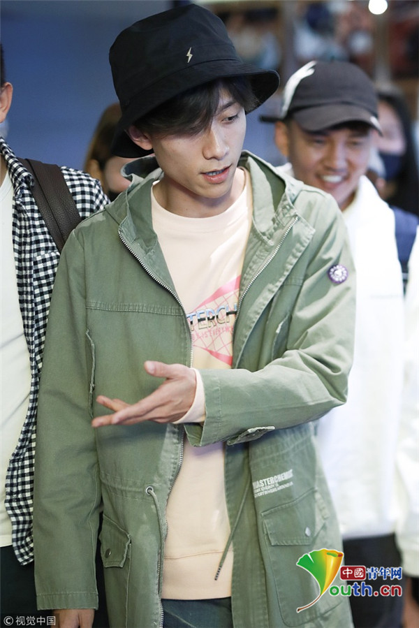 2018年10月14日,上海,張一山抵達(dá)上海機場。張一山戴漁夫帽眼袋嚴(yán)重瞬間老十歲, 用手擋臉?biāo)撇辉干乡R。