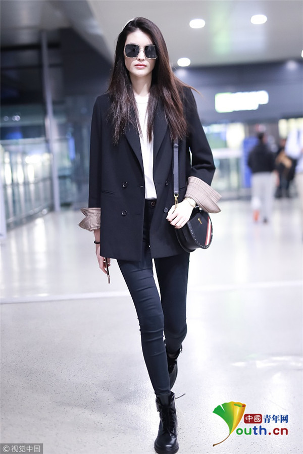 2018年10月15日,上海,何穗亮相機(jī)場(chǎng)。她身穿深色西裝搭配黑色緊身褲大秀超模身材,簡(jiǎn)約造型依舊高級(jí)感十足,輕撩秀發(fā)散發(fā)女人味。