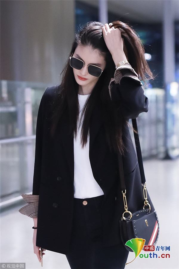 2018年10月15日,上海,何穗亮相機(jī)場(chǎng)。她身穿深色西裝搭配黑色緊身褲大秀超模身材,簡(jiǎn)約造型依舊高級(jí)感十足,輕撩秀發(fā)散發(fā)女人味。