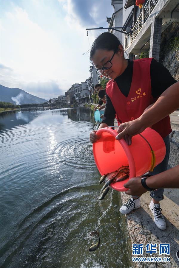 10月17日,河橋鎮(zhèn)的青年黨員們?cè)阪?zhèn)邊的昌南溪投放魚(yú)苗。新華社記者 徐昱 攝
