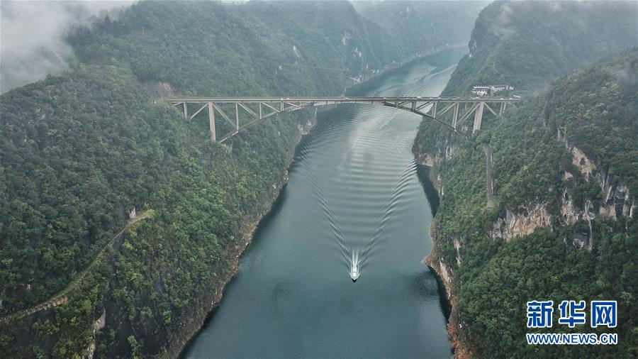 10月18日無(wú)人機(jī)航拍的江界河大橋。 當(dāng)日,位于貴州甕安縣的江界河大橋云霧環(huán)繞,景美如畫(huà)。 新華社記者歐東衢攝