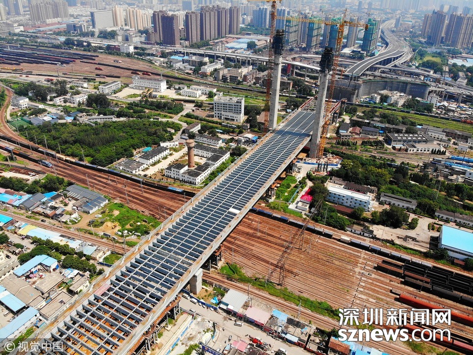 在橋梁頂推的同時,設(shè)計高度為150米的主塔也在不斷“長高”,目前高度為130米?!爸魉跇蛄耗媳眱蓚?cè)各有一個,均為每次(8~10天)升高6米。”閆斌說,主塔預(yù)計在9月中旬澆筑到位,10月份將安裝斜拉索。