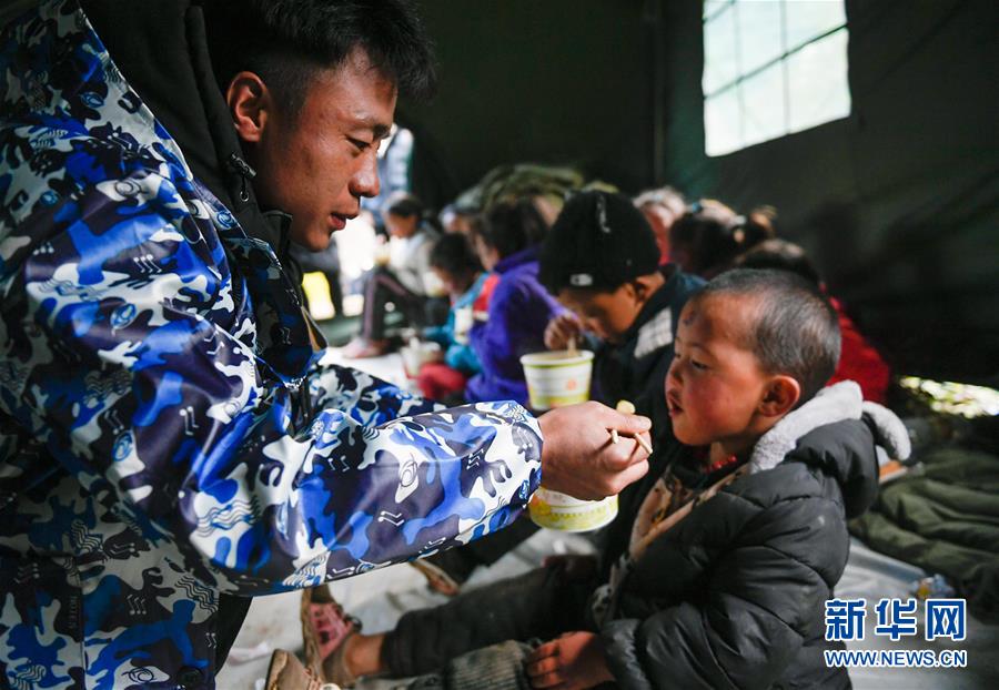 波羅鄉(xiāng)一名工作人員在臨時(shí)過渡安置點(diǎn)帳篷內(nèi)給一名兒童喂飯(10月14日攝)。 新華社記者 劉東君 攝