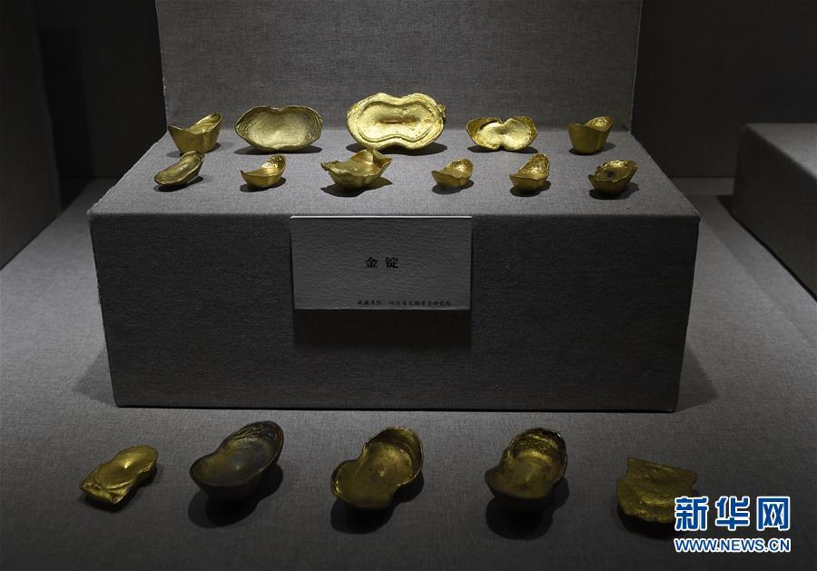 這是在四川博物院展出的金錠(10月21日攝)。 當(dāng)日,由四川省文化廳、四川省文物局、眉山市人民政府主辦的“江口沉銀——四川彭山江口古戰(zhàn)場遺址考古成果展”在四川博物院開幕。此次展覽共展出文物521件,展期將持續(xù)至2019年1月18日。四川彭山江口古戰(zhàn)場遺址是2017年度全國十大考古新發(fā)現(xiàn)之一,共發(fā)現(xiàn)文物42000余件。 新華社記者劉坤攝