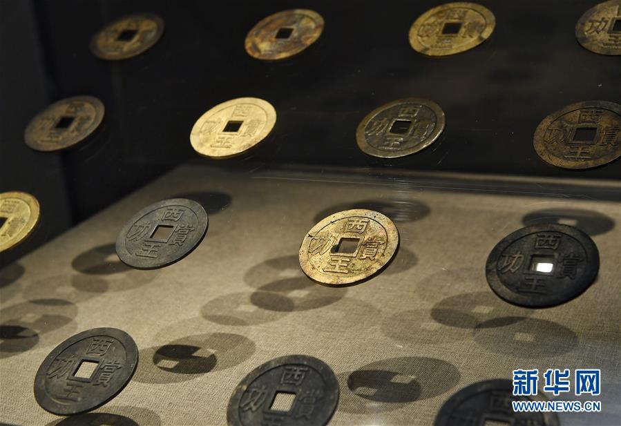 這是在四川博物院展出的“西王賞功”錢幣(10月21日攝)。 當(dāng)日,由四川省文化廳、四川省文物局、眉山市人民政府主辦的“江口沉銀——四川彭山江口古戰(zhàn)場遺址考古成果展”在四川博物院開幕。此次展覽共展出文物521件,展期將持續(xù)至2019年1月18日。四川彭山江口古戰(zhàn)場遺址是2017年度全國十大考古新發(fā)現(xiàn)之一,共發(fā)現(xiàn)文物42000余件。 新華社記者劉坤攝