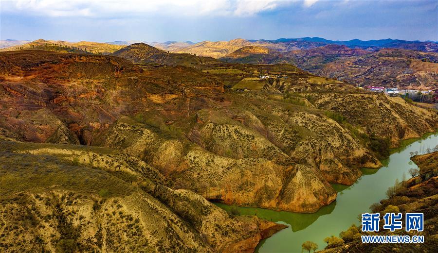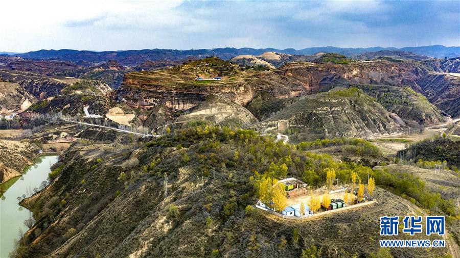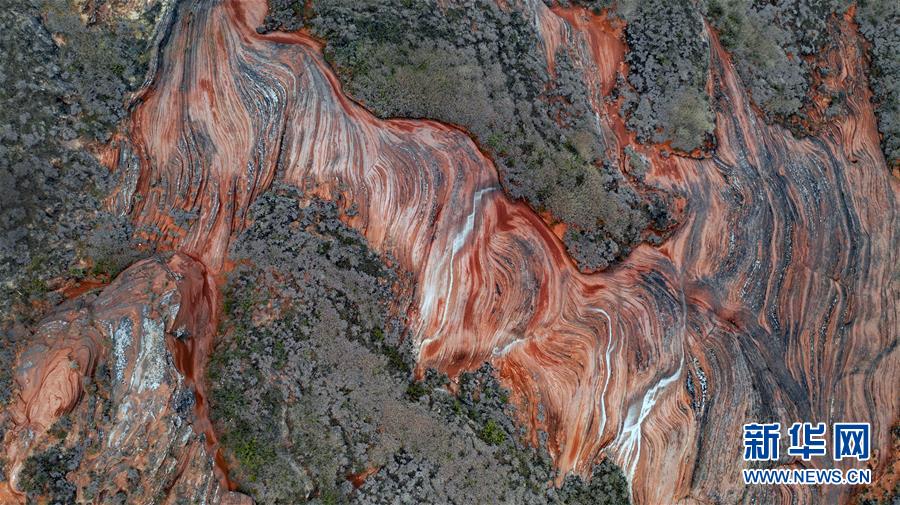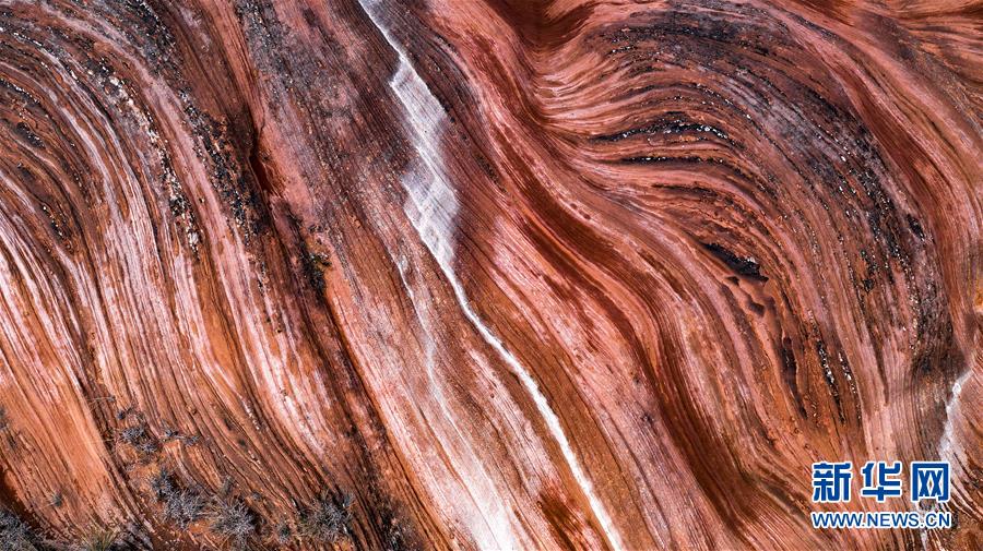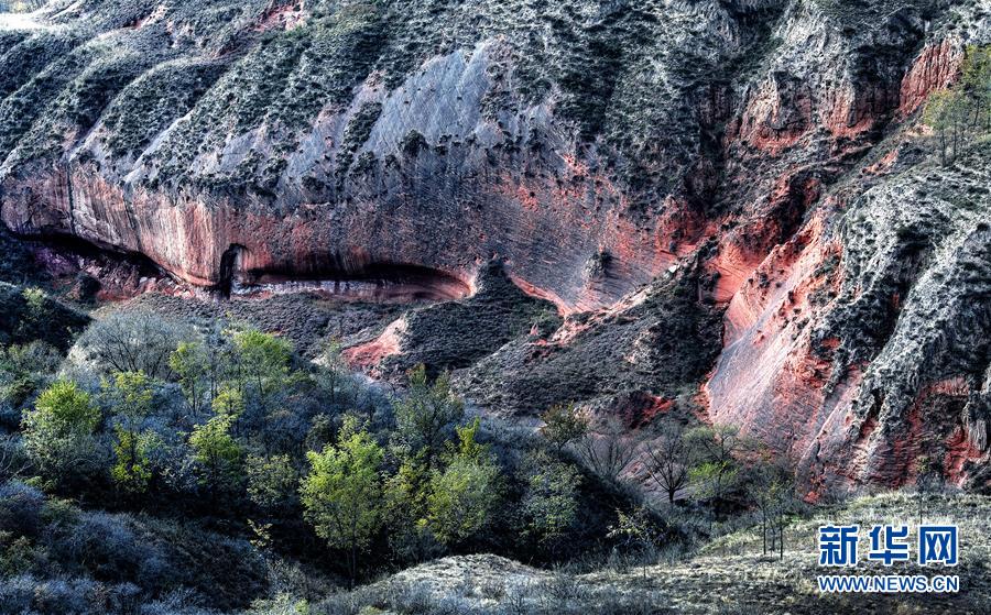 在黃土高原的陜西省延安市安塞區(qū)坪橋鎮(zhèn)王家灣,有一處峽谷丹霞地貌,是2017年陜西省地質(zhì)調(diào)查院在陜北及渭北地區(qū)發(fā)現(xiàn)大規(guī)模丹霞地貌的一部分。這里的山勢頂部被黃土覆蓋,底部經(jīng)流水下切侵蝕紅色砂巖外露,出露的巖石紋理如波浪,深秋中猶如一幅流動(dòng)的畫卷。