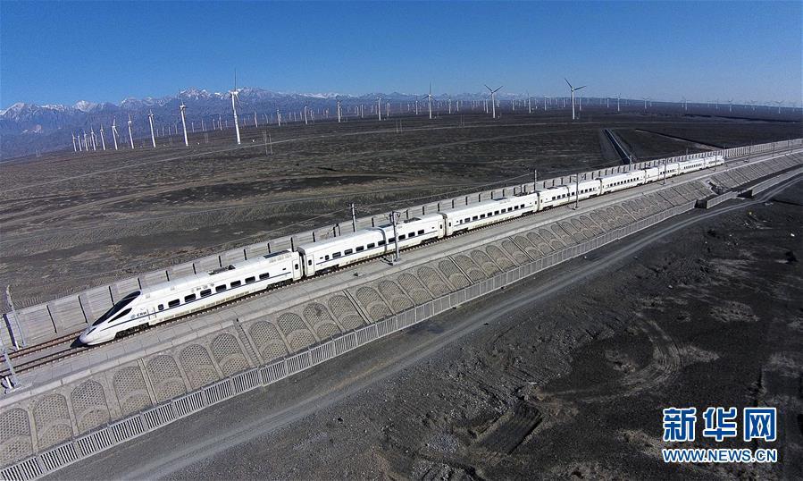 一輛和諧號動車穿行在新疆烏魯木齊達(dá)坂城風(fēng)力發(fā)電場的“風(fēng)車森林”里(2014年11月16日無人機(jī)拍攝)。今年以來,新疆穩(wěn)步推進(jìn)新能源參與“疆電外送”、擴(kuò)大與燃煤自備電廠調(diào)峰替代交易等多種電力交易方式,著力破解“綠色電力”上網(wǎng)難題,新能源發(fā)電量同比增加近13個百分點(diǎn),而棄電量和棄電比實(shí)現(xiàn)“雙降”,綠色發(fā)展理念進(jìn)一步落實(shí)。 新疆是我國重要的能源供應(yīng)和儲備基地,風(fēng)能、太陽能儲量豐富。近年來,新疆新能源裝機(jī)總量突破2700萬千瓦,規(guī)模和占比均居全國前列。新華社記者 江文耀 攝