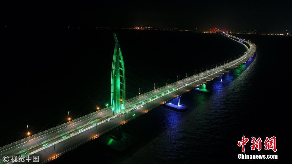 2017年12月30日,珠海,港珠澳大橋九洲航道橋、江海直達(dá)船航道橋燈火璀璨,在五顏六色的裝飾燈映襯下,整座大橋熠熠生輝。王榮 攝 圖片來源:視覺中國