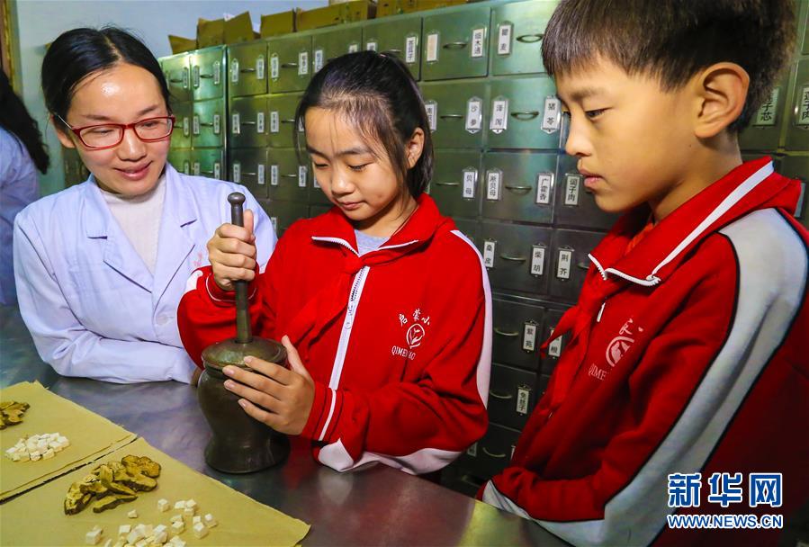 10月22日,安平縣啟蒙小學(xué)學(xué)生在安平縣中醫(yī)院醫(yī)生的指導(dǎo)下體驗(yàn)用傳統(tǒng)工具加工中草藥。 當(dāng)日是世界傳統(tǒng)醫(yī)藥日,河北省安平縣啟蒙小學(xué)組織學(xué)生走進(jìn)安平縣中醫(yī)院,通過(guò)參觀(guān)中藥房、認(rèn)識(shí)常見(jiàn)中藥、感受中藥加工等方式,向小學(xué)生普及中醫(yī)藥知識(shí),弘揚(yáng)傳統(tǒng)中醫(yī)藥文化。 新華社記者李曉果攝