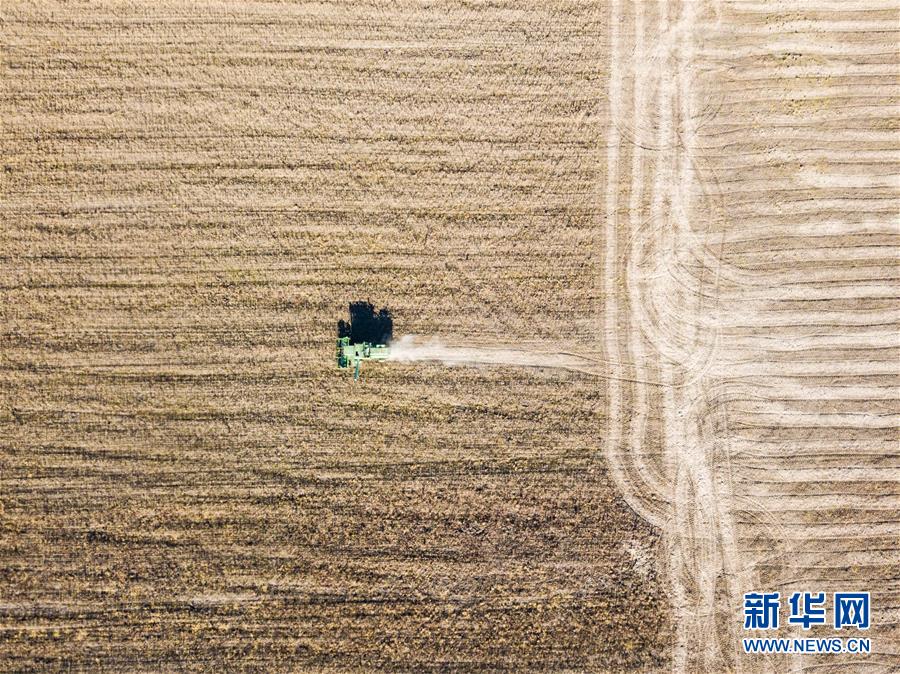 村民在俄羅斯猶太自治州比羅比詹市附近的大豆農(nóng)場(chǎng)里勞作(10月19日攝)。新華社記者張若玄攝