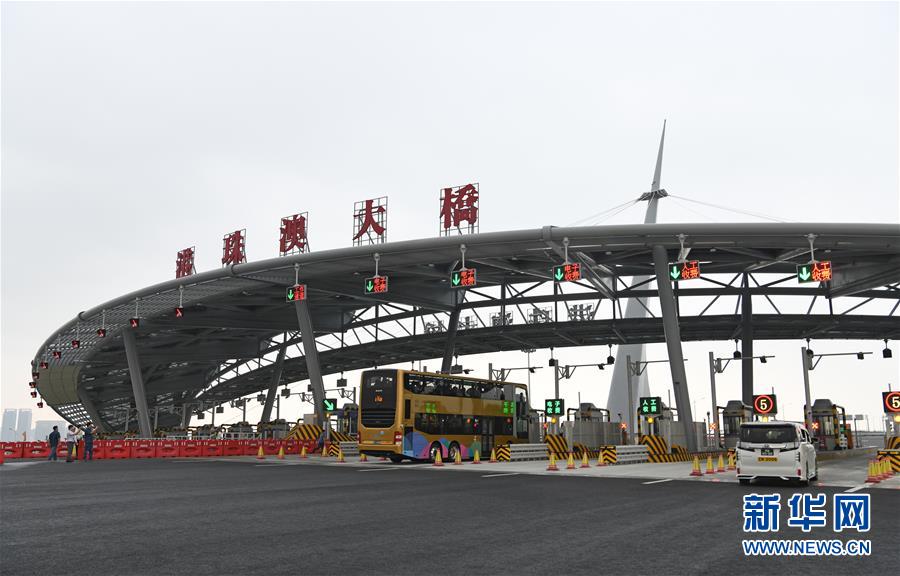 10月24日,跨境巴士在澳門口岸離境車道上通關(guān)。當(dāng)日9時,港珠澳大橋正式通車。 新華社記者張金加攝