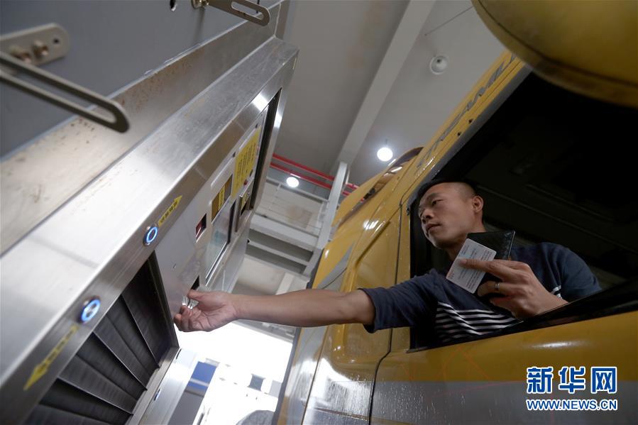 10月24日,港珠澳大橋珠海公路口岸通車(chē)的首票進(jìn)口貨物貨車(chē)司機(jī)在抵達(dá)一站式貨車(chē)進(jìn)境驗(yàn)放通道時(shí)按指紋。 當(dāng)日,港珠澳大橋正式通車(chē)。