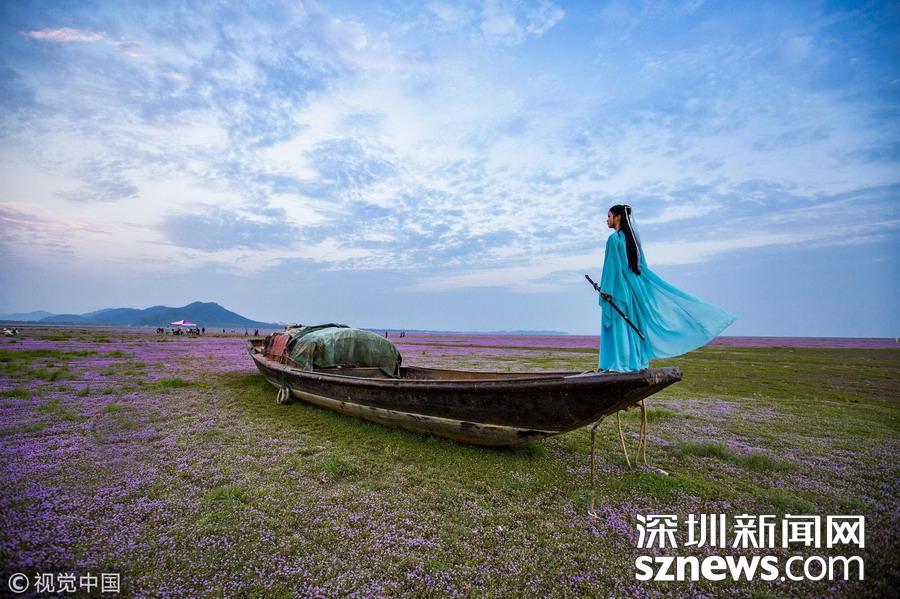 2018年10月23日,南昌,游人在江西鄱陽湖都昌濕地蓼子花海內(nèi)游玩。連日來,中國第一大淡水湖江西鄱陽湖濕地大面積蓼子花開放,秋景宜人,紫色的花海吸引大批游客前來賞景游玩。