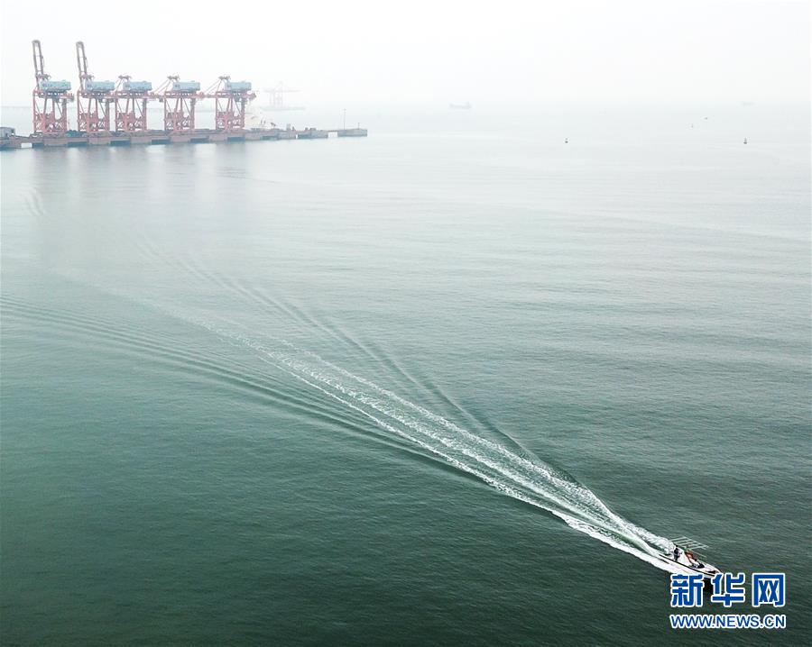 10月24日,一艘運(yùn)輸貨物的快艇行駛在廣西防城港碼頭海域(無(wú)人機(jī)拍攝)。 新華社記者 魏海 攝