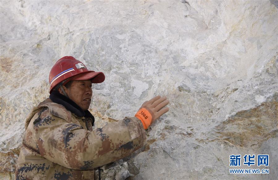 在昆侖山上海拔4000米的興發(fā)達玉礦,工程師田仲祥展示一塊正在開采的玉石礦體(10月23日攝)。 新華社記者武巍攝