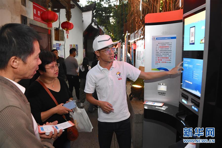 10月29日,工作人員在向市民介紹福州智慧社區(qū)自助服務(wù)平臺(tái)。 10月28日至30日,由福州市政府聯(lián)合支付寶主辦的首屆天下碼商大會(huì)在福建福州舉行。 新華社記者 姜克紅 攝