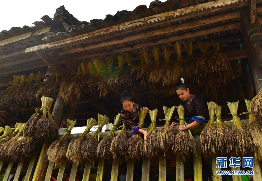 10月30日,在廣西融水苗族自治縣安太鄉(xiāng)元寶村,村民在風雨橋上晾曬剛剛收獲的香糯。新華社記者 吳建路 攝