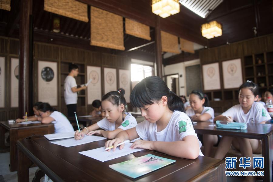 小學(xué)生在浙江省德清縣乾元鎮(zhèn)國學(xué)圖書館參加國學(xué)夏令營(2018年7月19日攝)。浙江省德清縣積極推進(jìn)鄉(xiāng)鎮(zhèn)特色圖書館建設(shè),將閑置老建筑改造成設(shè)計(jì)獨(dú)特、藏書豐富、活動(dòng)多彩的圖書館,有力助推鄉(xiāng)村文化振興。新華社記者 翁忻旸 攝