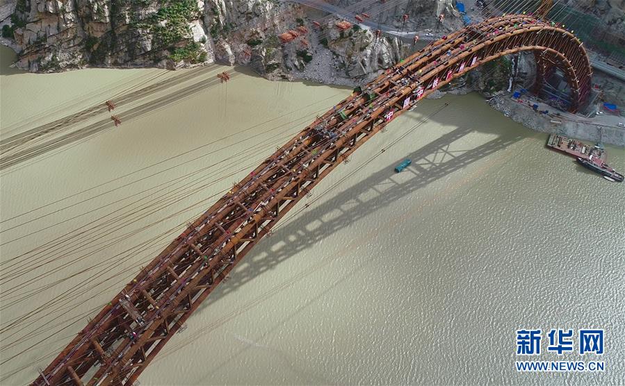 9月28日拍攝的川藏鐵路拉林段重點標志性工程藏木特大橋合龍儀式現(xiàn)場。 當日,隨著最后一節(jié)鋼管拱的對位和鎖定完畢,川藏鐵路拉林段藏木特大橋成功合龍,標志著大橋主體結(jié)構(gòu)施工取得了關(guān)鍵性勝利。藏木特大橋由中國中鐵廣州局集團承建,拱高112米,橋橫跨雅魯藏布江峽谷,水深66米。 新華社記者普布扎西攝