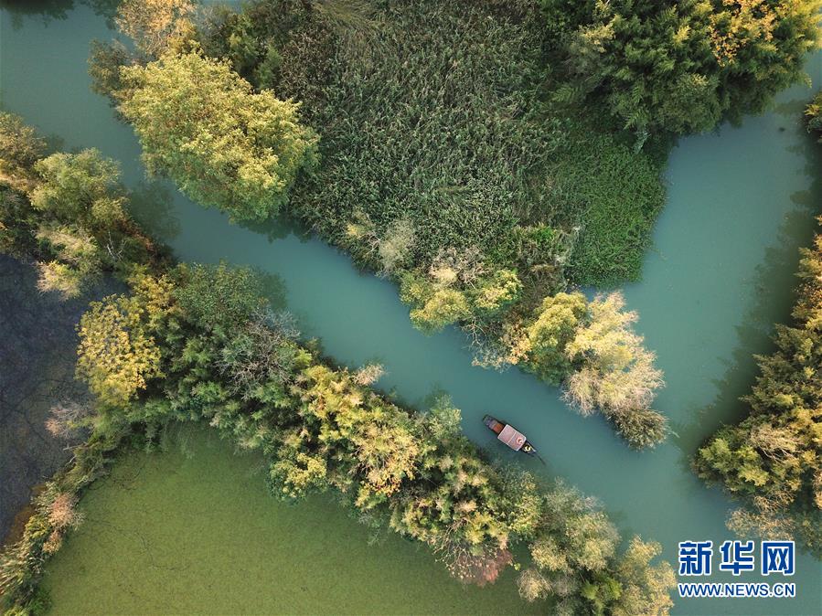 10月29日,游船行駛在西溪濕地河道上(無(wú)人機(jī)拍攝)。 新華社記者翁忻旸攝