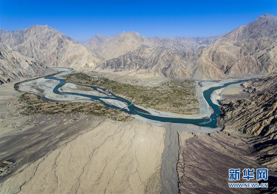 這是位于昆侖山深處的克孜勒蘇柯爾克孜自治州阿克陶縣庫(kù)斯拉甫鄉(xiāng),葉爾羌河從村莊流過(10月27日無人機(jī)拍攝)。 新華社記者 關(guān)俏俏 攝