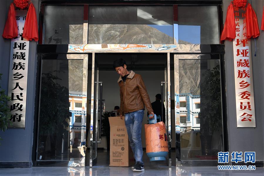 在隴南市武都區(qū)“新坪埡”,村民到鄉(xiāng)政府領(lǐng)取幫扶單位贈(zèng)送的灶具(10月31日攝)。新華社記者 范培珅攝