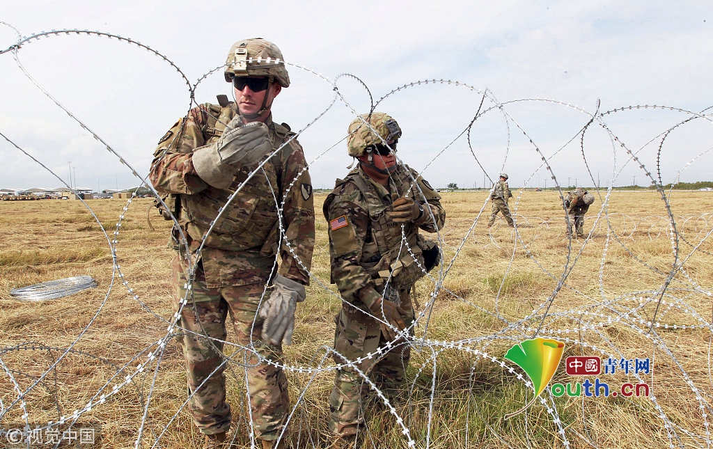 當(dāng)?shù)貢r(shí)間2018年11月4日,美國(guó)得克薩斯州Donna,美國(guó)士兵在美國(guó)與墨西哥邊境的入境口岸附近鋪設(shè)鐵絲網(wǎng)圍欄,應(yīng)對(duì)中美洲移民壓境。