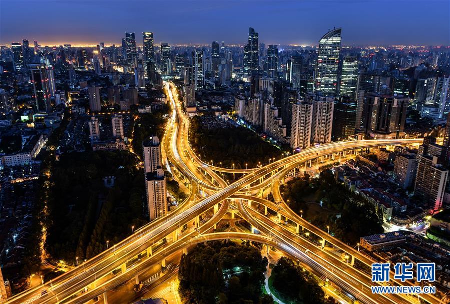 這是11月2日拍攝的上海延安高架路與南北高架路交匯處的立交橋。 首屆中國國際進口博覽會即將在上海開幕。美麗的上海張開懷抱,迎接八方來客。 新華社記者 李鑫 攝