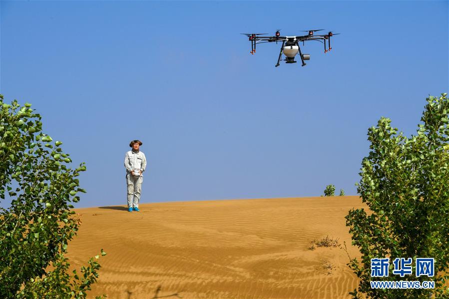 在內(nèi)蒙古鄂爾多斯市杭錦旗的庫布其沙漠中,技術(shù)人員操控無人機飛播造林(7月11日攝)。