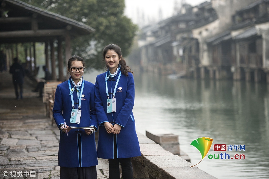 2016年11月16日,浙江烏鎮(zhèn),第三屆世界互聯(lián)網(wǎng)大會首日,身著群青鸞鳳刺繡旗袍的大學(xué)生禮儀賣萌自拍,成為會議間隙的一道風(fēng)景。