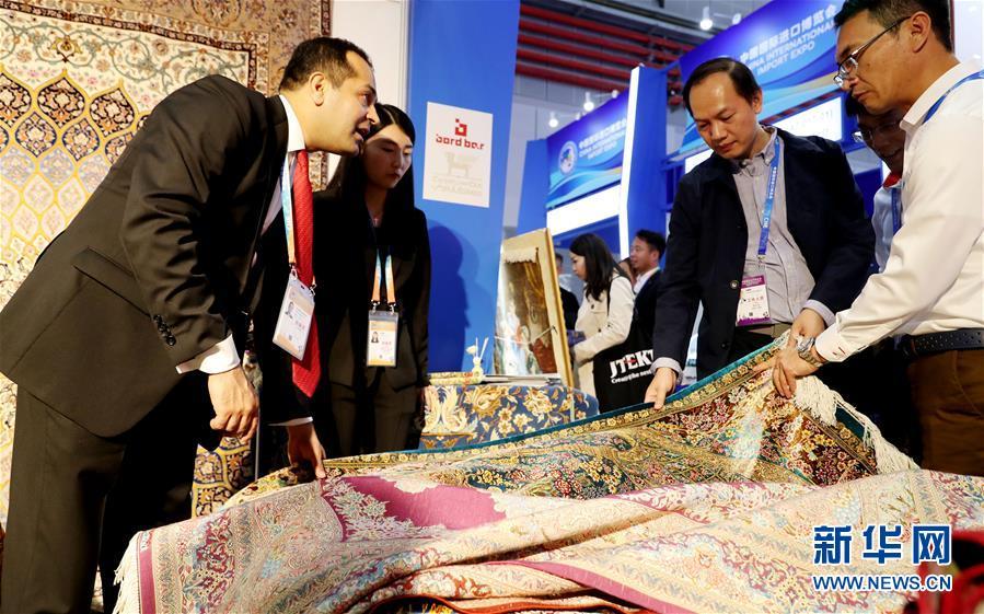 11月5日,一名來(lái)自伊朗的地毯展商(左)向參觀者介紹產(chǎn)品。 新華社記者 方喆 攝