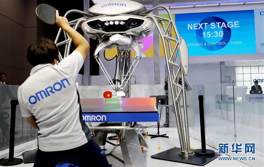11月5日,一名工作人員在歐姆龍展臺演示與機器人進行乒乓球對戰(zhàn)。新華社記者 方喆 攝