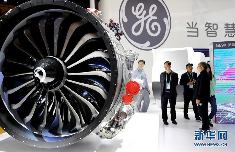11月5日,參觀者在美國通用電氣公司生產的飛機發(fā)動機模型旁駐足。