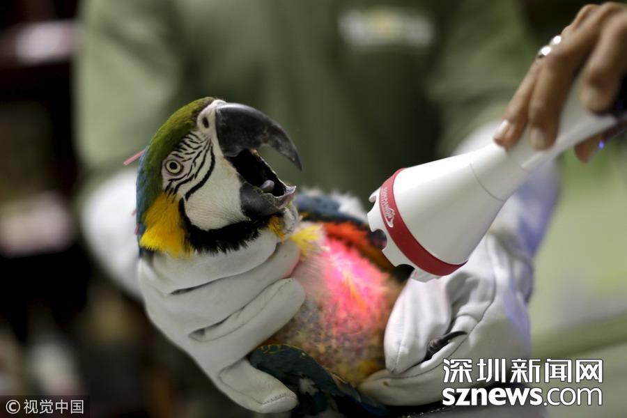 當(dāng)?shù)貢r間2015年7月30日,巴西巴西利亞,一只藍(lán)喉金剛鸚鵡正在接受激光治療。