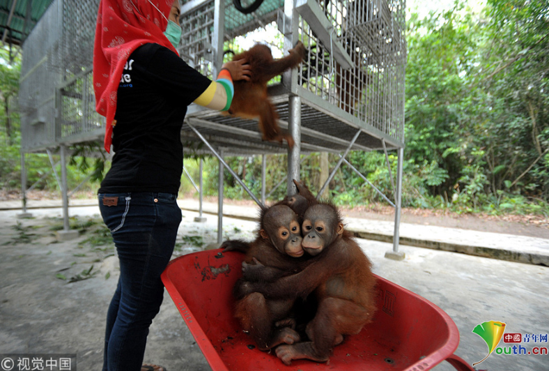 當(dāng)?shù)貢r間2018年9月18日,印尼加里曼丹克塔邦,國際動物救援(IAR)猩猩安全與保護(hù)中心里,飼養(yǎng)員用獨(dú)輪車把猩猩寶寶送到森林學(xué)校。圖片作者:Newscom