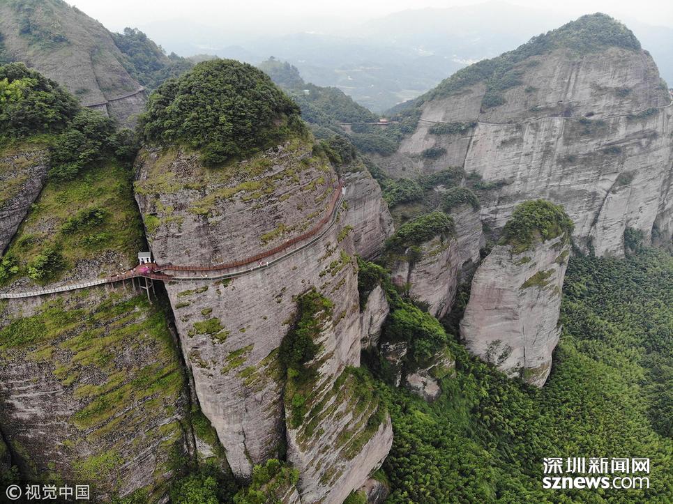 深圳新聞網(wǎng)訊 2018年6月19日,航拍江西贛州南武當山百米高空玻璃棧道。棧道緊貼峭壁,在懸崖之上凌空蜿蜒穿行,猶如一條玉龍盤旋在綠林石海之中。 南武當山位于江西最南端的龍南縣武當鎮(zhèn)境內(nèi),景區(qū)核心面積達到13.5平方公里,擁有99座千姿百態(tài)的巍峨石峰,丹霞地質(zhì)風貌突出,連綿十里,被稱為“武當十里畫廊”。