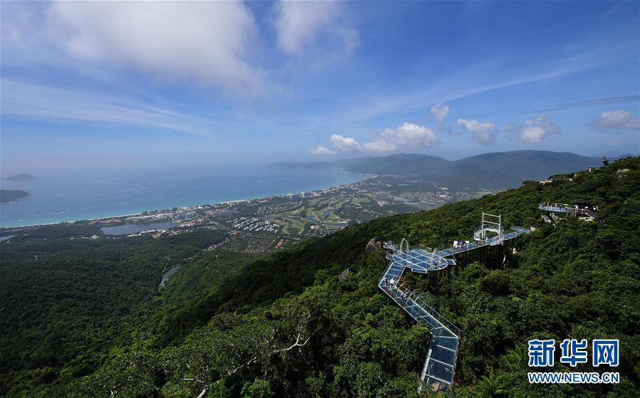 8月31日,游客在玻璃觀景平臺上參觀游覽。近日,位于海南省三亞市亞龍灣熱帶天堂森林公園的大佛石全海景玻璃棧道開始正式營業(yè)。凌空而建的玻璃棧道全長400米,游客可將亞龍灣的美景盡收眼底。新華社記者郭程攝