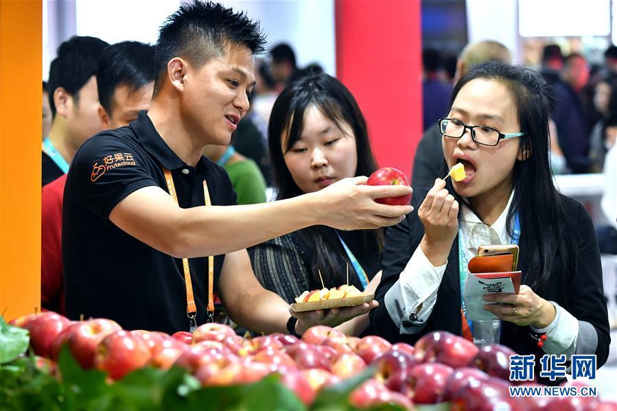 11月7日,好果云公司的工作人員(左)為參觀者介紹從美國進口的一款蘋果。